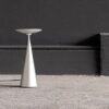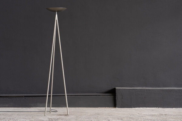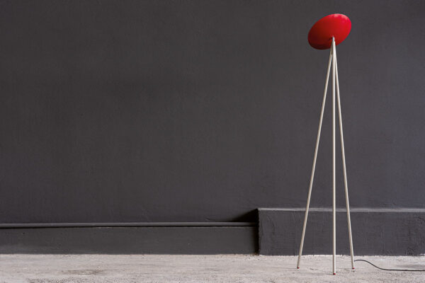Palomar, a floor lamp dated 1984, in Codiceicona’s 2019 re-edition reveals a slender tripod of long cylindrical-section painted metal rods, aggregated at the extreme end of one end, to support the steel parabola that reflects the light, fulcrumed on the joint that allows it to be oriented. The absolute respect for the original lines of the whole confirms the timeless appeal of Palomar. The adaptation of the technical parts, with the adoption of LEDs, which can be fitted with dimmers, highlights its adequate usability.